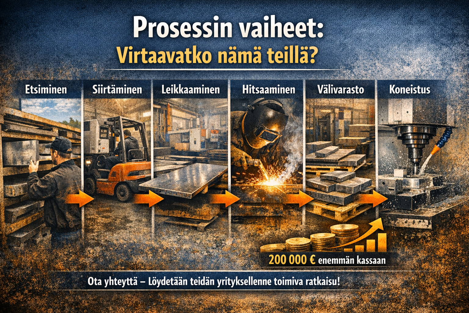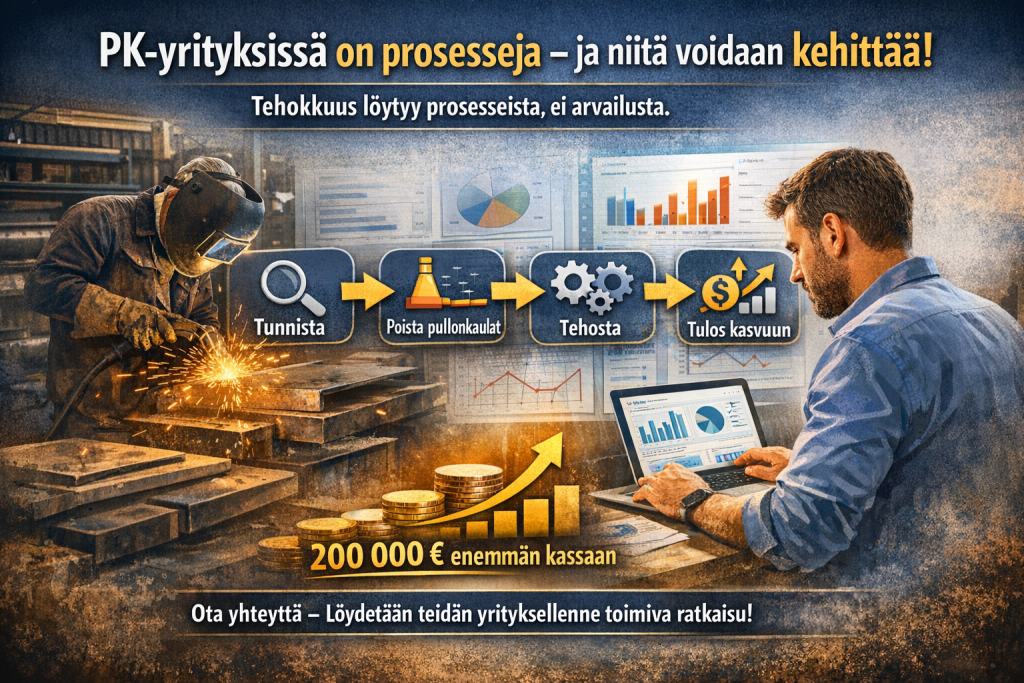 Moni yrittäjä ajattelee, ettei omassa konepajassa tai tuotantoympäristössä ole varsinaisia prosesseja. Todellisuudessa jokainen työvaihe, siirto ja odotus muodostaa prosessin, haluttiin sitä tai ei. Yrityksen koko ei muuta tätä.